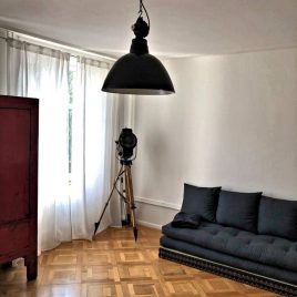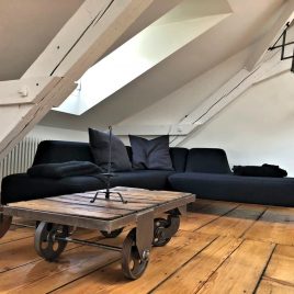 Ein wunderschönes Beispiel für eine tolle Stil-Melange, die unseren Kundinnen perfekt gelungen ist. Unsere Industriehocker, Filmscheinwerfer. Fabriklampen und vintage Palettenwagen als Coffee Table ergänzen perfekt das klare ZEN-Ambiente dieser geräumiger Dachgeschosswohnung.