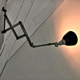 Vintage Midgard Scherenleuchte Diese vintage Midgard Scherenleuchte (Scherenlampe) ist durch ihre Schönheit und ihre Größe ein wahrer Eyecatcher. Der Schirm ist aus hochwertig emailliertem Blech - außen schwarz, innen weiß. Innen sieht man dem Schirm dieser vintage Midgard Lampe sein Alter an: im vorderen Bereich ist die Emaille-Schicht  abgesplittert. Wir haben die entsprechenden Stellen gründlich konserviert - dies verleiht dieser vintage Midgard Scherenleuchte ein starkes Aussehen. Sie ist eben kraftvoll und ehrlich. Der originale Drehschalter sowie die Elektrik funktionieren tadellos. Auf Wunsch verkabeln wir diese vintage Midgard Leuchte nach VDE-Normen neu (zzgl. 45,00 Euro) oder arbeiten sie auf unser "Supreme"-Niveau (bis auf den Schirm werden alle Einzelteile abgeschliffen und konserviert - zzgl. 170,00 Euro). Der Scherenarm dieser vintage Midgard Leuchte funktioniert ebenfalls tadellos und lässt sich ohne jegliches Spiel verstellen. Der Entwurf stammt von Curt Fischer. Mehr zu Midgard findet ihr hier. Abmessungen: max. Ausladung: ca. 115 cm (in komplett ausgestrecktem Zustand) Schirm: Höhe ca. 12 cm, Durchmesser ca. 16 cm Preis: 649,00 Euro inkl. Versand innerhalb Deutschlands (außer Inseln) Verfügbarkeit anfragen: [contact-form-7 id="60" title="Produktanfrage"]