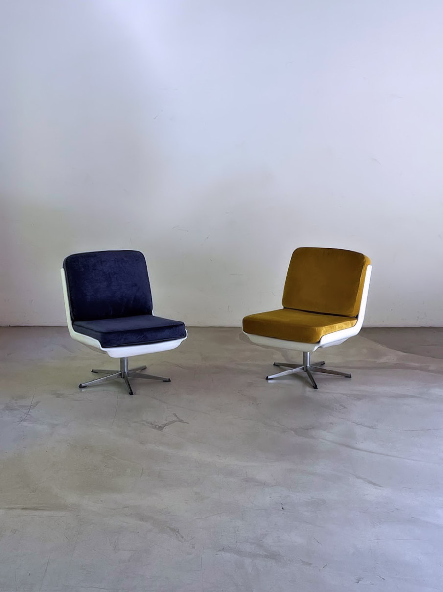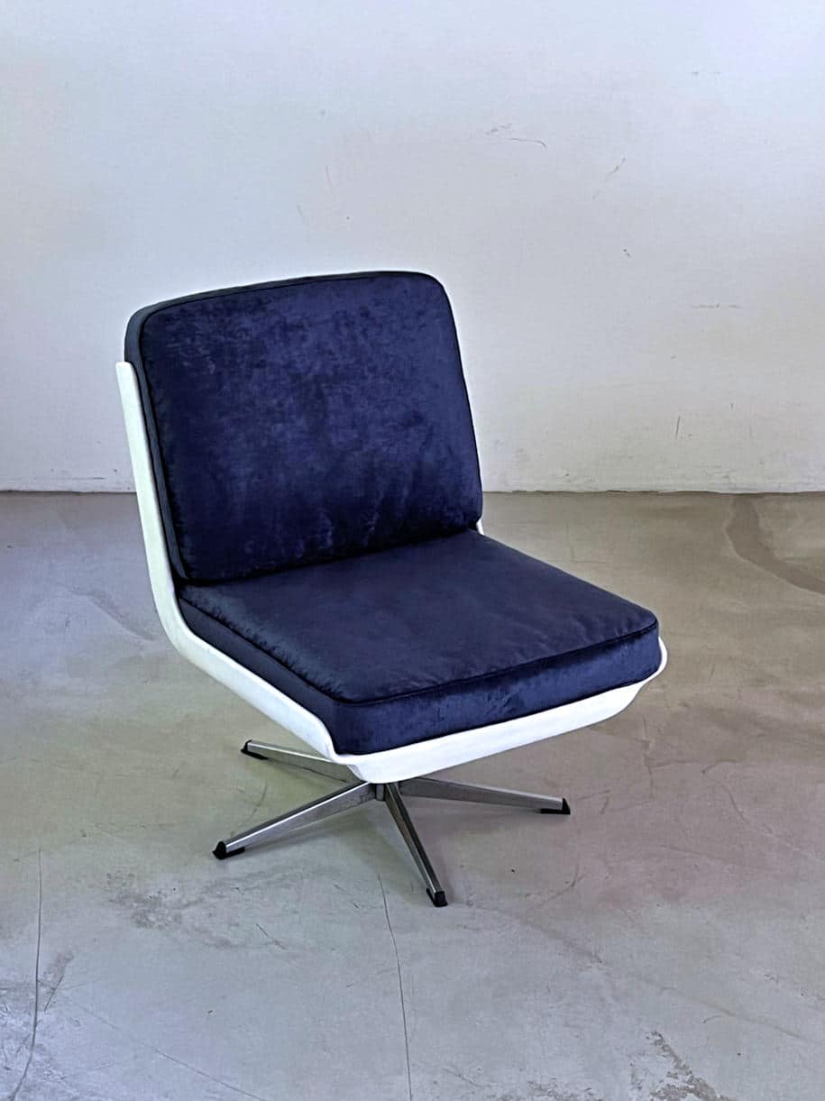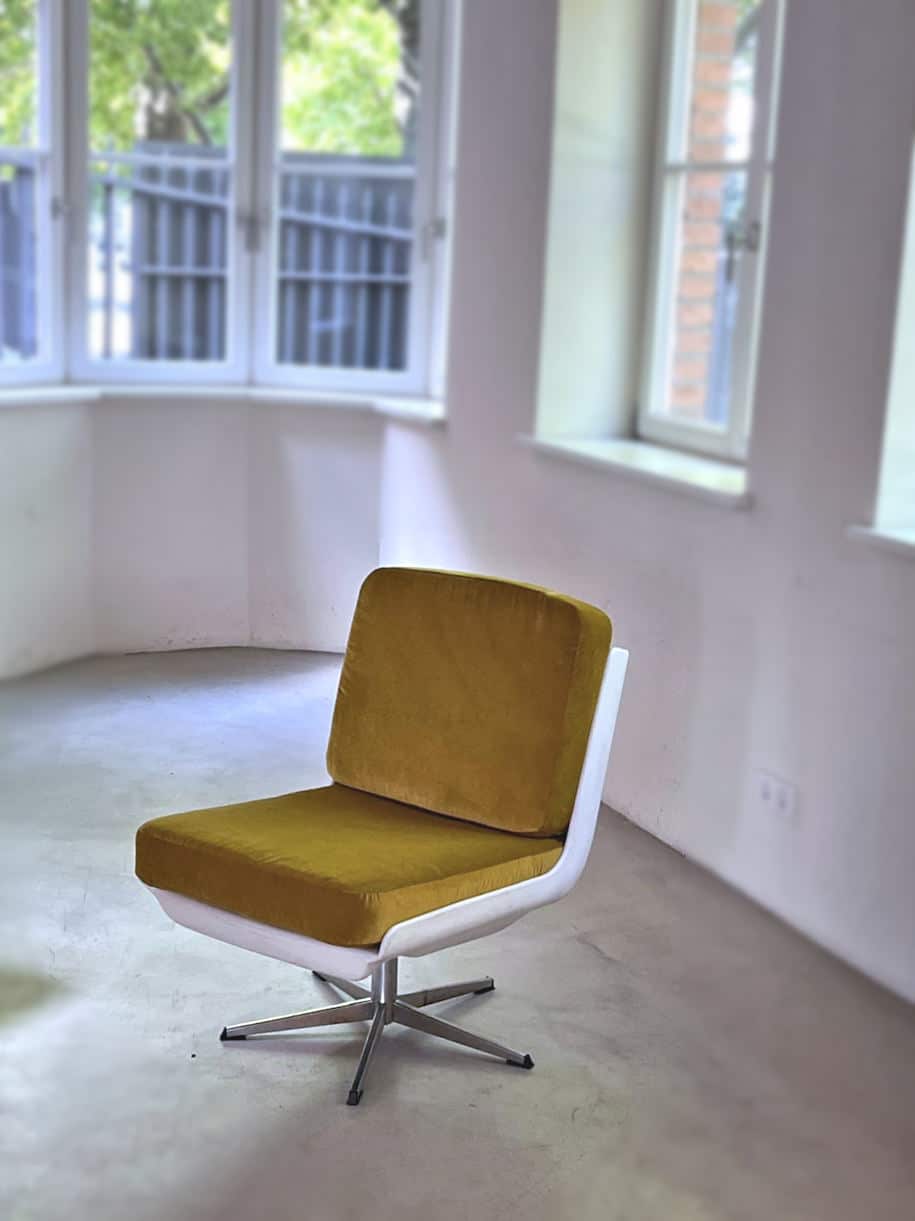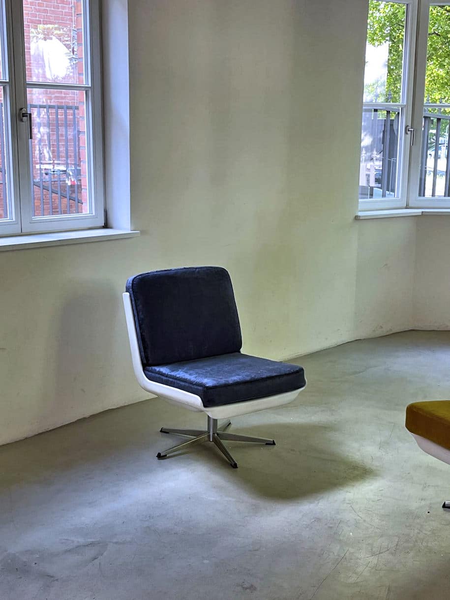 Der Vintage Variopur Lounge Sessel – 70er Jahre Designsessel in Gelb und Blau verbindet zeitloses Mid-Century-Design mit höchstem Sitzkomfort und exklusiven Materialien. Sein ikonisches Variopur-Gestell aus den 1970er Jahren ist drehbar, stabil und optisch ein echter Blickfang – ob im Wohnbereich, im stilvollen Office oder in einer modernen Lounge.